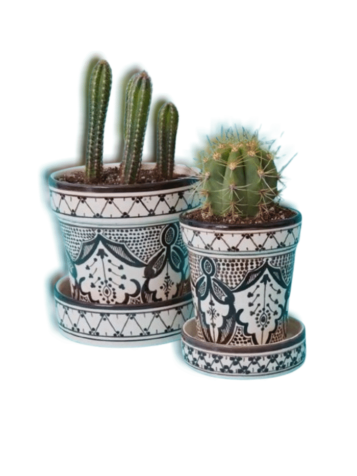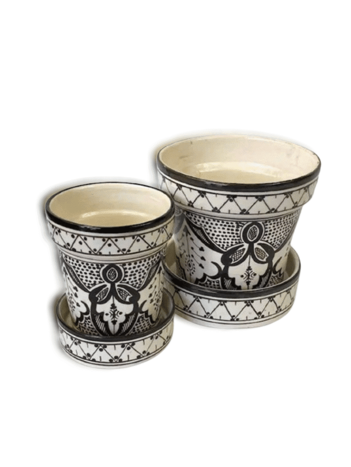 Handmade Moroccan ceramic planter pot with saucer. Hand-painted, unique oriental patterns (black/white). Ideal for indoor/outdoor plants. Multiple sizes.