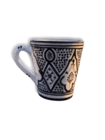 Authentic handcrafted Moroccan style ceramic mug. Hand-painted with intricate black and white geometric designs. Perfect for coffee or tea. Adds artisanal charm to your home.