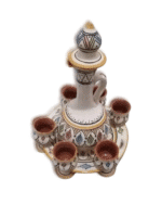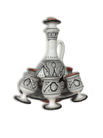 Serve your drinks with elegance and authenticity using this magnificent complete ceramic drinkware set. Entirely shaped and painted by hand by artisans, this set includes a slender carafe (pitcher) with its stopper, six matching stemmed goblets, and a coordinating round tray. Each piece is unique and showcases traditional craftsmanship.