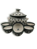 Authentic hand-painted ceramic serving set from Safi, Morocco, featuring distinctive green trim. Includes a lidded pot with handles & 6 bowls. Available in two traditional patterns: classic Black & White Geometric or vibrant Multicolor Geometric.